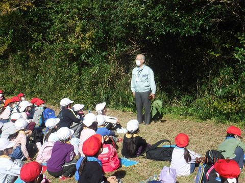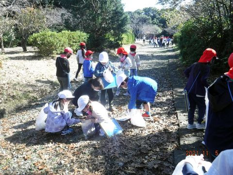 今年は青空に恵まれ、班別活動ではマテバシイなどの木の実拾いや、果実や葉の良いにおいをかぐなどの学習を、またクラス別活動では森の中の園路を散策。黄葉やいろいろな木の実を見つけたようです。芝生広場でのお弁当(お昼)も楽しそうでしたね。