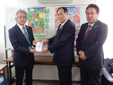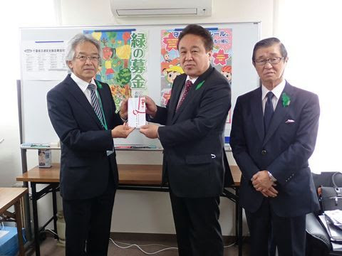 令和3年3月29日(月)、千葉県交通安全施設業協同組合 黒川恵史理事長(左側の写真・中央 )から緑の募金に多額のご寄付をいただきました。例年のチャリティゴルフによる寄付はコロナ禍で中止としたものの、「やはり緑化のために何か実行しよう」との声が上がり、組合員からの寄付を纏めて下さったとのことです。