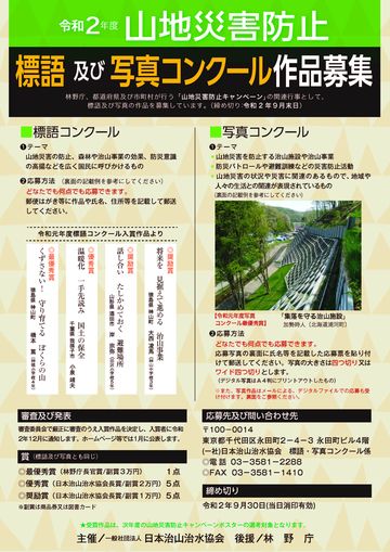 コンクール 2020.05.29 【終了しました】令和2年度 山地災害防止 標語・写真コンクール 作品募集 「山地災害キャンペーン」の関連行事として、令和2年度も標語&写真コンクールの作品募集が全国的に行われます。 当緑化推進委員会の治山林道事業の一環として広く募集いたします。 なお、当該コンクールの主催は一般社団法人日本治山治水協会であり、応募先等も同協会になりますのでご注意ください。 応募〆切は令和2年9月末日です。応募要領等、詳しくは緑化推進委員会ホームページで。 令和元年度国土緑化運動ポスター原画コンクール「入賞作品集」(PDF版) 【終了しました】緑化ポスターコンクール入賞作品の展示 (千葉信用金庫 印西市店)