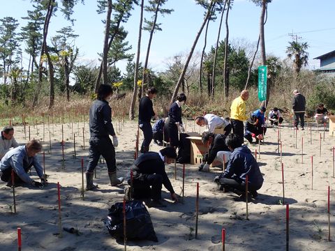 緑の募金・東日本復興事業として、令和2年3月12日(木)に白子町中里の海岸県有保安林に1,000本のクロマツが植樹されました。例年、白子町みどりの少年団(白子中学校)の皆さんを中心に行っている同植樹祭ですが、新型コロナウイルス感染症の影響で、今年は白子町ホテル組合有志によって植樹されました。