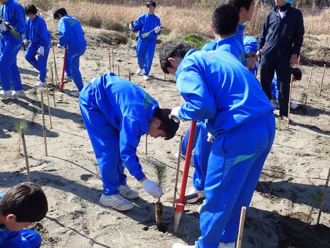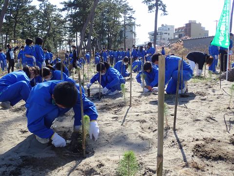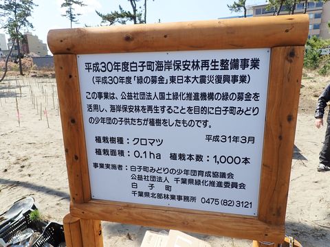 平成31年3月14日(木)に白子町中下海岸の海岸県有保安林において、緑の募金・東日本復興事業として、植樹祭が行われました。林町長さんから「植樹するだけではなく、後々まで私たちの安全な生活に欠かせない海岸保安林の成長を見守って欲しい」との挨拶の後、白子町みどりの少年団(白子中学校の1~2年生)の皆さんが抵抗性クロマツ1,000本を植樹。同少年団は、津波と松くい虫被害等によって、疎林化が進む海岸保安林に毎年のように植樹を行っています。