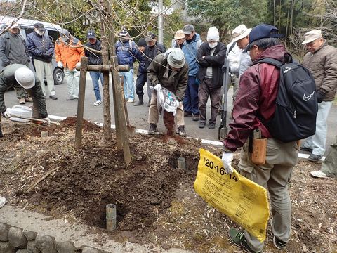 市町村がさくら保全管理講習会を計画し、千葉県さくらの会が樹木医を講師として派遣する事業を、平成31年2月17日(日)に鴨川市の嶺岡林道で開催しました。今回は、南房総桜守の会が中心となり、林道沿いにある水田三喜男元大蔵大臣の生家をお借りして座学を行うとともに、林道に新たに植栽したシダレザクラとソメイヨシノを対象として、空気管の設置、不用枝の切断、てんぐ巣病の除去の実技指導を行いました。