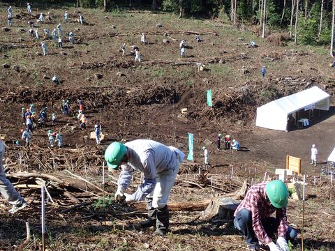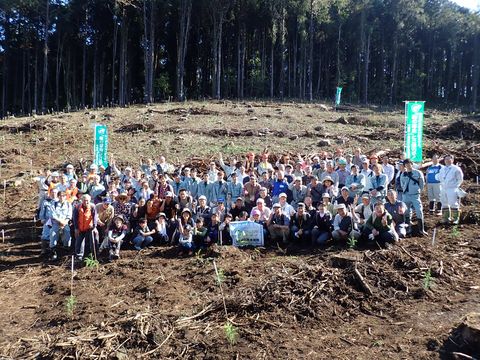 今年は明治改元から150年目にあたります。明治期に開始された県営林の歴史や、近年の課題となっている「森林の循環利用」について多くに方々に理解を深めていただこうと、千葉県、千葉県緑化推進委員会の共催、県民参加によるみどりの再生事業実行委員会の協力で、平成30年11月10(土)に富津市桜井の県営林で記念植樹祭を行いました。県民や企業・団体など多方面から約100名の参加があり、1,200本の植樹のほか、美しく管理された人工林の視察や、「森林のいまむかし」と題した写真展も併せて行いました。なお、この記念植樹祭の一部には「緑の募金」を活用して実施しました。