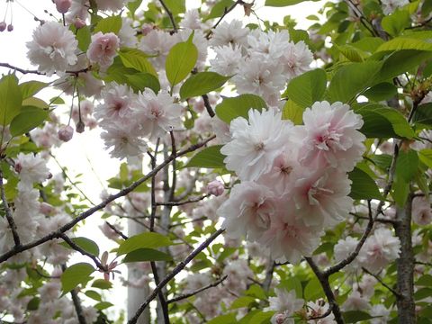 鎌足さくらはヤマザクラの一種と考えられる八重桜で、淡桃白色に変化する花弁が清楚さと気品を感じさせます。(写真参照)