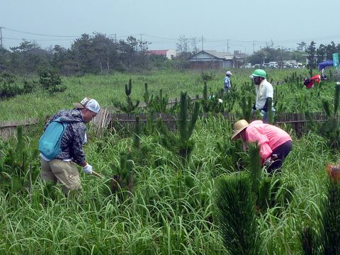28年7月14日(木)、匝瑳市吉崎浜の海岸保安林「緑化推進委員会(緑の募金)」の下刈行事を実施しました。震災以降の海岸林再生のモデルフィールドとして、県民、企業、団体など多方面からの参加者が1つの森を継続的に育てているもので、25年3月に植樹を行い、今回は4回目の下刈作業。