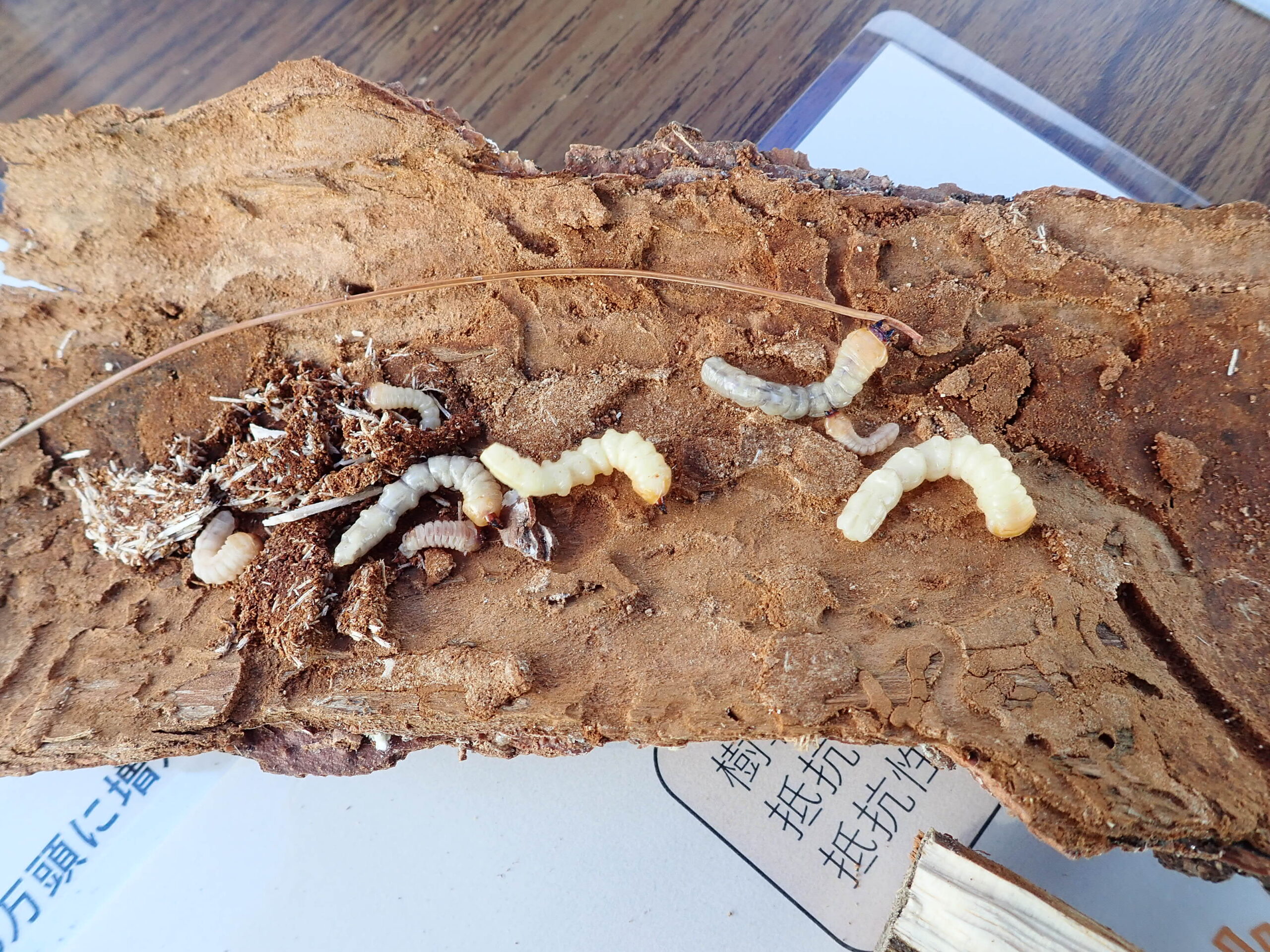 被害木の中にマツノマダラカミキリの幼虫を発見。松くい虫被害は、マツノマダラカミキリが新成虫として飛び立つ際に、樹体内の大量のマツノザイセンチュウを体内に入れ運び屋となり被害を拡散します。