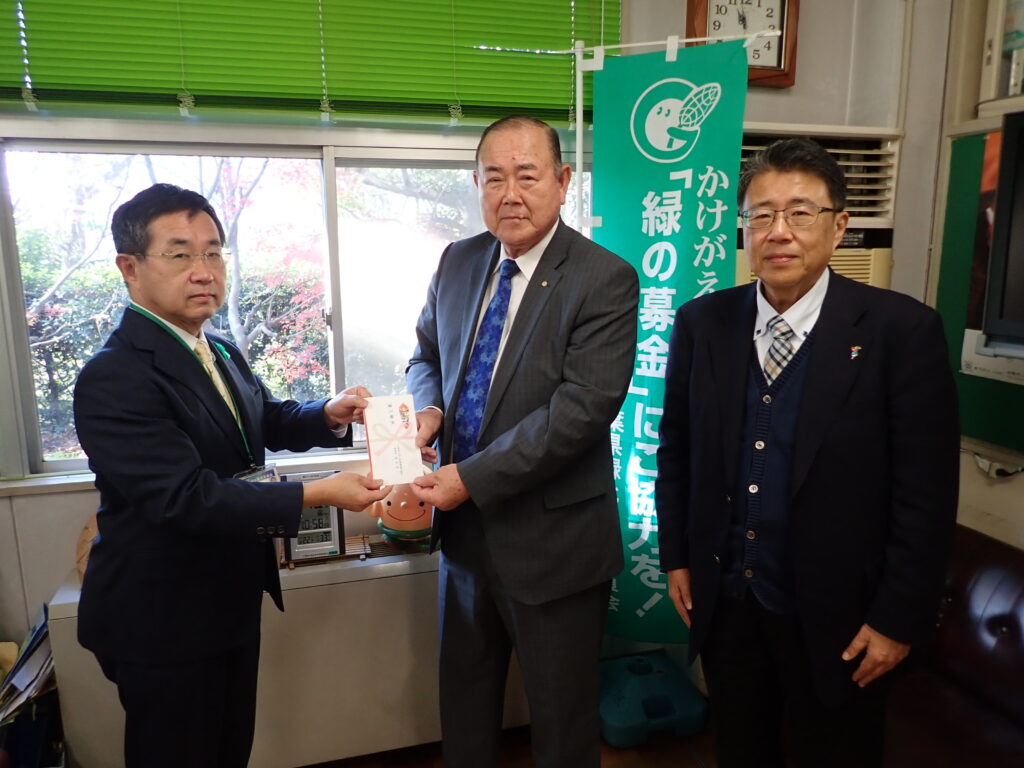 千葉県中部山砂事業協同組合様におかれましては、緑化に対する組合員の取り組みの一つとしてチャリティーゴルフを催され、令和7年12月12日、緑の募金に多額のご寄付をいただきました。写真は、剣持純一 代表理事(写真中央)、石渡安博 事務局長(写真右)からの寄贈の様子です。情報交換の際には、大勢の児童生徒が参加している国土緑化運動ポスター原画コンクールについて話題になり、剣持代表理事からは、こうした緑化事業に有効に活用してほしいとのお言葉がありました。