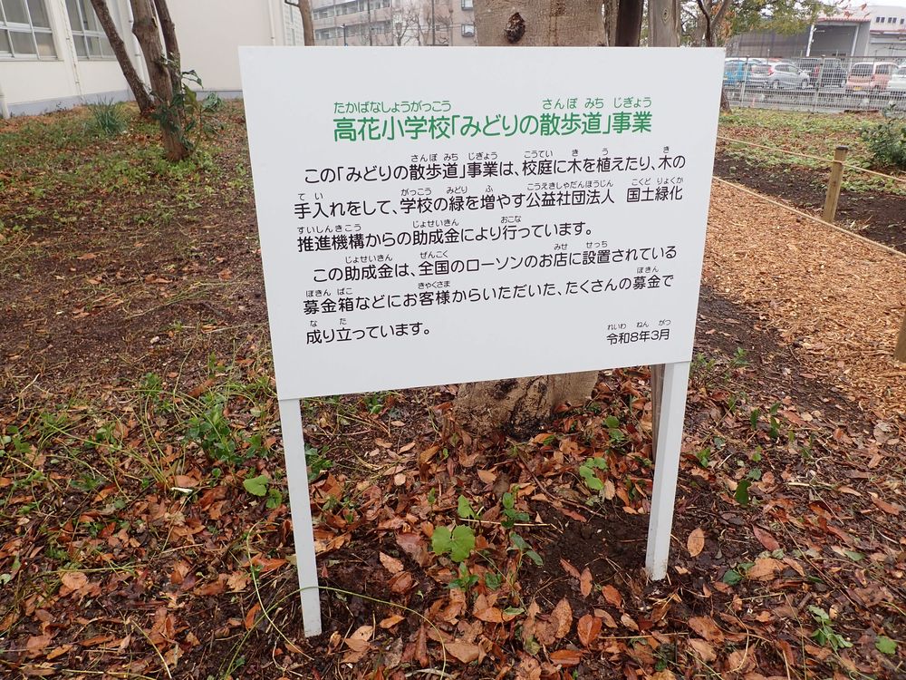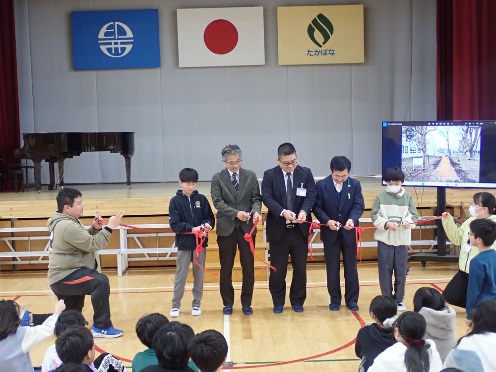 そのひとつの印西市立高花小学校では、令和8年3月3日(火)に、児童やご父兄代表、ローソン関係者、市教育委員会の皆さまほかが参加され完成式典が開かれました。本来は本事業で整備された「森の散歩道」で行われる予定でしたが、雨天のため体育館で実施。みどりの散歩道の整備の様子をディスプレイで紹介いただきながら、テープカットなど予定されていたセレモニーが行われました。
