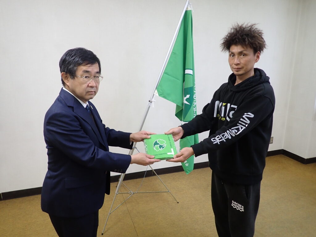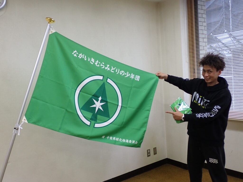 長生村の子供たちやサーフィン関係者、青少年育成に携わる関係者などを中心に「ながいきむらみどりの少年団」が結成されました。令和7年9月には結成していたのですが、ようやく令和8年3月25日、少年団旗及びスカーフの贈呈式を、村役場担当職員の立ち合いのもと実施することができました。(写真右:ながいきむらみどりの少年団長)